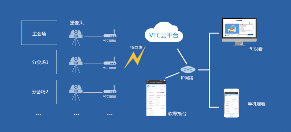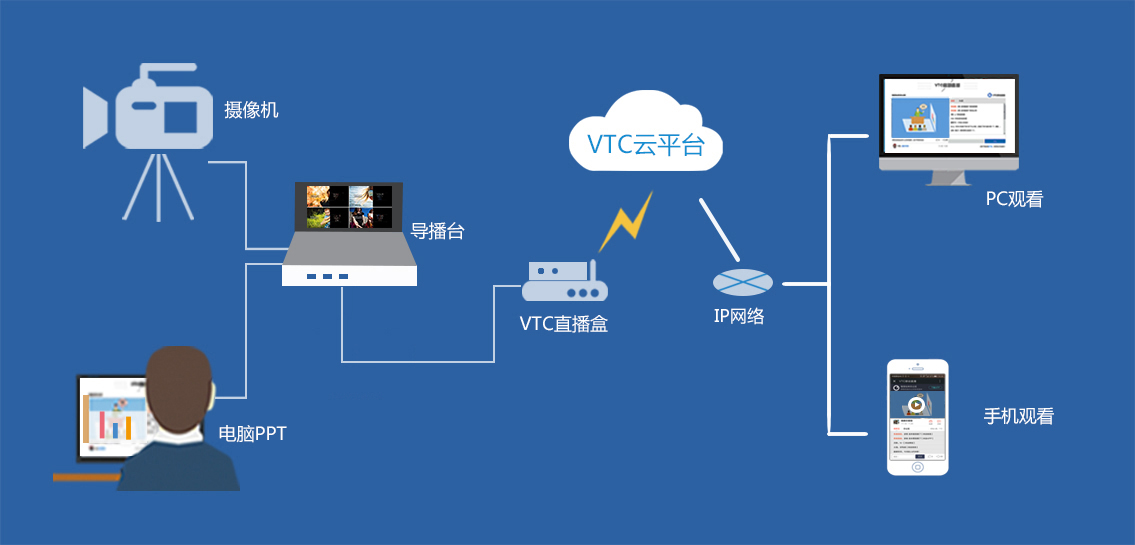 VTC提供多种直播方案,有标准的专业摄像头、摄像机直播方案(如图1),还提供定制的直播方案, 如多路视频导播台切换直播的方案(如图2),如需了解更多直播方案,请拨打咨询热线。