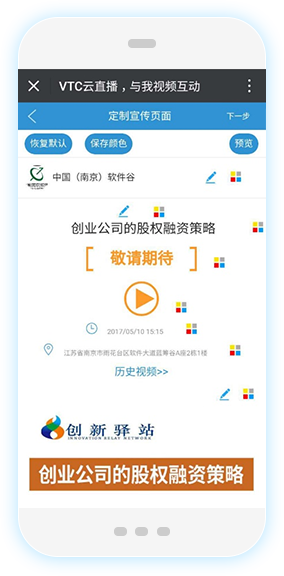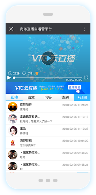 VTC云直播业务平台: 由一系列云服务功能模块组成,为商务会议、企业培训、活动营销行业客户提供丰富的场景化线上互动。